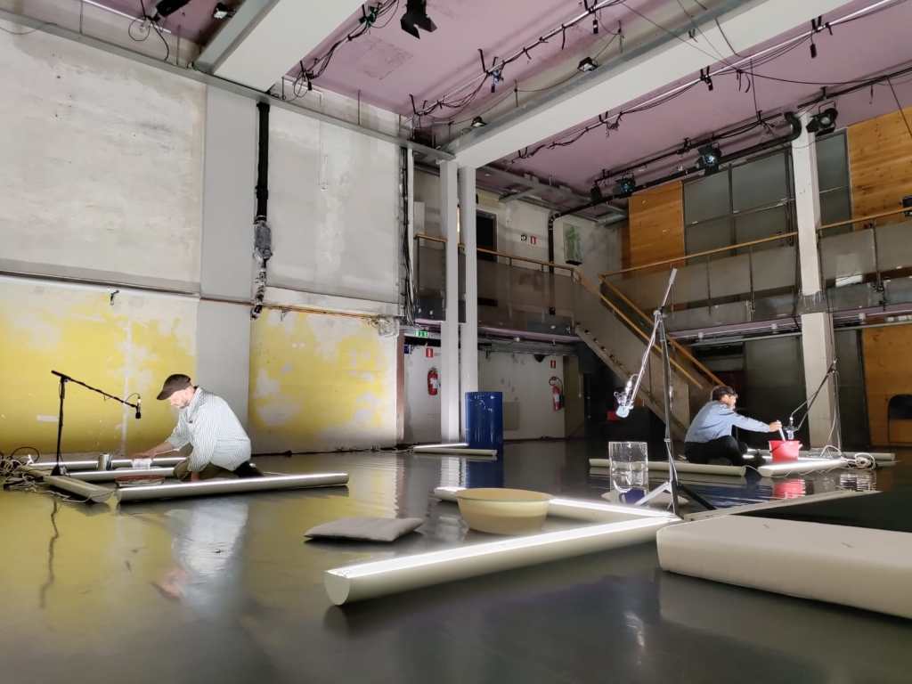 Hara Alonso and Pontus Pettersson have investigated the common space in an installation of gestures, sound and water. They have worked in parallel with score creation and scores, two important methods in Western contemporary music and dance.